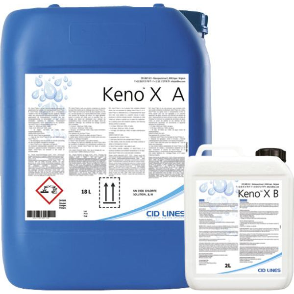 Keno X A+B is een 2-componenten oplossing waar de B-component (2L) fungeert als activator van de A-component (18L). Zo ontstaat chloordioxide, die 2,5 keer krachtiger is dan een gewone chloordesinfectie en volledig smaak- en geurloos is.
