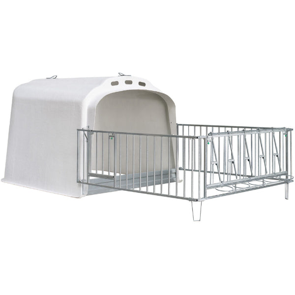 Het hekwerk biedt een ruime buitenruimte en is compleet te maken met een grote selectie aan voeraccessoires. Het ene zijhekwerk heeft een toegangspoortje voor gemakkelijke toegang en het andere zij hekwerk bevat vijf uitneembare spijlen, waardoor u hier perfect een kalverdrinkbak of andere accessoires kan monteren.