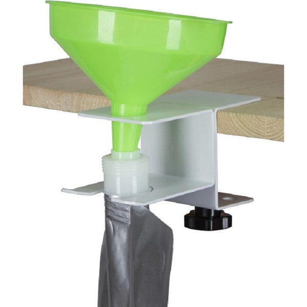 Hoe te gebruiken: plaats de steunhulp op een stabiele plaats (vb. een tafel) en schuif de biestzak met de vulopening in de vulhulp zodat deze hangt. Plaats dan de trechter op de steun van de vulhulp en giet de biest in de biestzak.