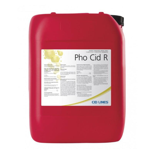 Pho Cid R is een zuur reinigingsmiddel voor de reiniging en ontkalking van het melkwinningsmateriaal inclusief melkrobotreiniging. Product op basis van Fosforzuur en citroenzuur ; bevat geen zwavelzuur.
