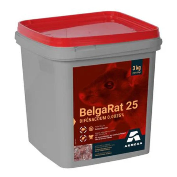 BelgaRat 25 is een professioneel rattengif dat verwerkt is tot een uiterst aantrekkelijk graanlokaas. Tarwe is namelijk de natuurlijke voedingsbron voor bruine ratten waardoor ze dit lokaas niet kunnen weerstaan. De actieve stof, difenacoum, heeft een krachtig bloedstollingsremmende werking waardoor muizen en ratten na enkele dagen sterven. Zo kan je dit ongedierte bestrijden zonder lokaasschuwheid te ontwikkelen.
