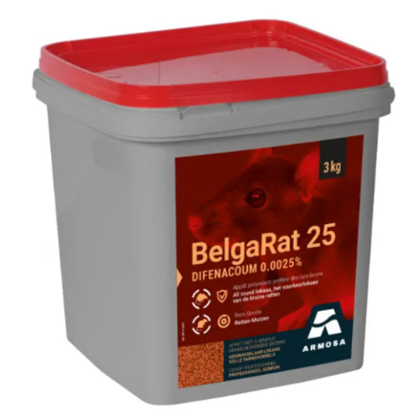 BelgaRat 25 is een professioneel rattengif dat verwerkt is tot een uiterst aantrekkelijk graanlokaas. Tarwe is namelijk de natuurlijke voedingsbron voor bruine ratten waardoor ze dit lokaas niet kunnen weerstaan. De actieve stof, difenacoum, heeft een krachtig bloedstollingsremmende werking waardoor muizen en ratten na enkele dagen sterven. Zo kan je dit ongedierte bestrijden zonder lokaasschuwheid te ontwikkelen.