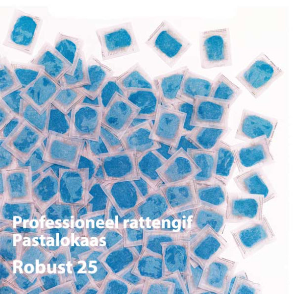 Robust 25 pasta is zeer aantrekkelijk, eenvoudig te gebruiken en lost zo goed als alle knaagdierproblemen op. Zeer werkzaam tegen huismuizen, zwarte- en bruine ratten De speciale formule met een hoog vetgehalte geeft aan de pasta een grote weerstand tegen vocht. Het productieproces garandeert een gelijkmatige verdeling van actieve stof in het lokaas wat een snelle en dodelijke opname van de actieve stof geeft.
