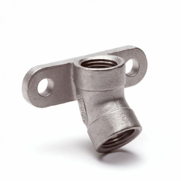 Muurplaat uit RVS met 2 bevestigingsgaten, voor het verbinden van 2 waterleidingbuizen onder een gewenste hoek of voor het monteren van een drinknippel.
