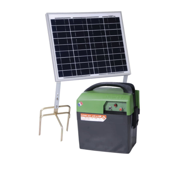 Het pakket bestaat uit een draagbaar batterij schrikdraadapparaat Clovic 355, een semi-tractie accu 12V - 80 ah, zonnepaneel 30W en 2 verzinkte grondsteunen.