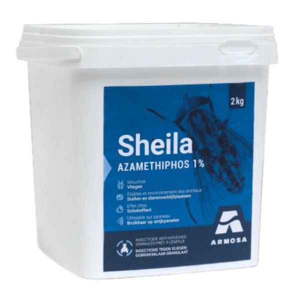 Sheila is een insecticide in granulaatvorm ter bestrijding van vliegen in dierverblijfplaatsen.