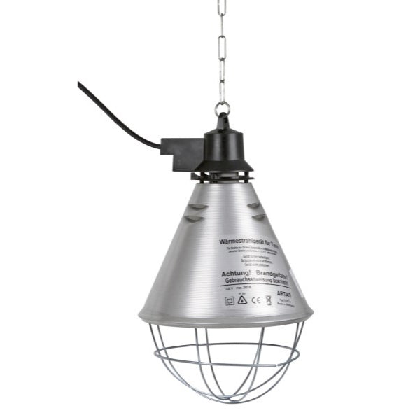Een aluminium beschermkap met een Ø van 21 cm en 6 ventilatiesleuven voor een betere luchtcirculatie en dus langere levensduur van de infraroodlamp. Inclusief een ophangketting met max. draagvermogen van 20 kg.