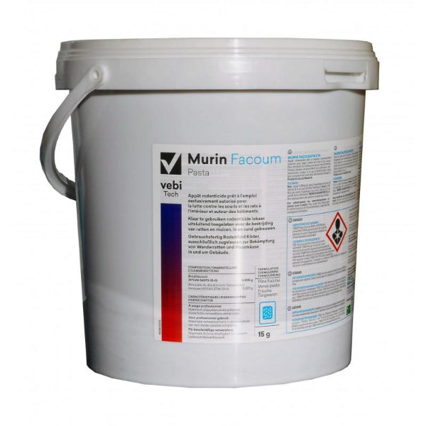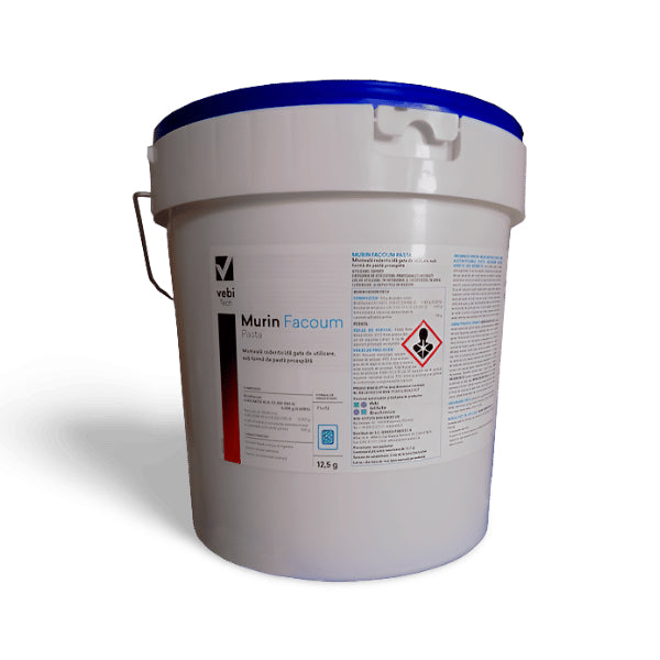 Murin pasta is zeer aantrekkelijk, eenvoudig te gebruiken en lost zo goed als alle knaagdierproblemen op. Zeer werkzaam tegen huismuizen, zwarte- en bruine ratten De speciale formule met een hoog vetgehalte geeft aan de pasta een grote weerstand tegen vocht. Het productieproces garandeert een gelijkmatige verdeling van actieve stof in het lokaas wat een snelle en dodelijke opname van de actieve stof geeft. Bloedstollingsremmend middel, enkele dagen na inname van het lokaas treedt de dood op. Verpakt in papieren zakjes (bio-degradeerbaar) van 12 gram. Bij gebruik in lokaasdozen wordt de pasta in de dozen opgegeten en niet verspreid. Ideaal voor gebruik bij GMP en HACCP.