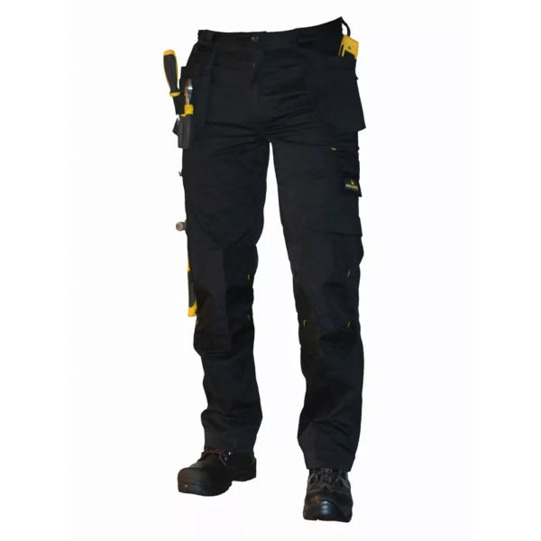 Zwarte werkbroek met stretchzones en driedubbel gestikt. Ongevouwen voorzakken, en vele zijvakken om uw materiaal veilig bij te houden. Tevens is het ook voorzien om knielappen, kniebescherming of kniepads in te schuiven.